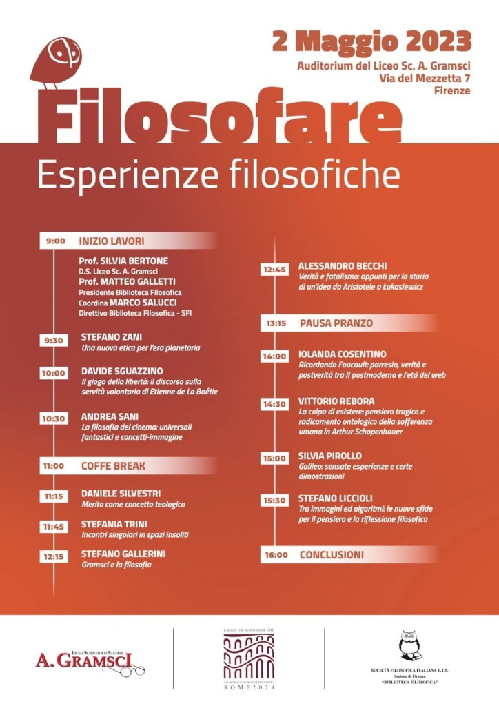 - Intervento su cinema e filosofia, La filosofia nel cinema, proposto nel quadro della rassegna cinematografica “Melting P(l)ot – Percorsi di cinema tra didattica e cittadinanza”, pensata per le scuole e organizzata dall’ACEC Toscana, Associazione Cattolica Esercenti Cinema, 16 marzo 2023