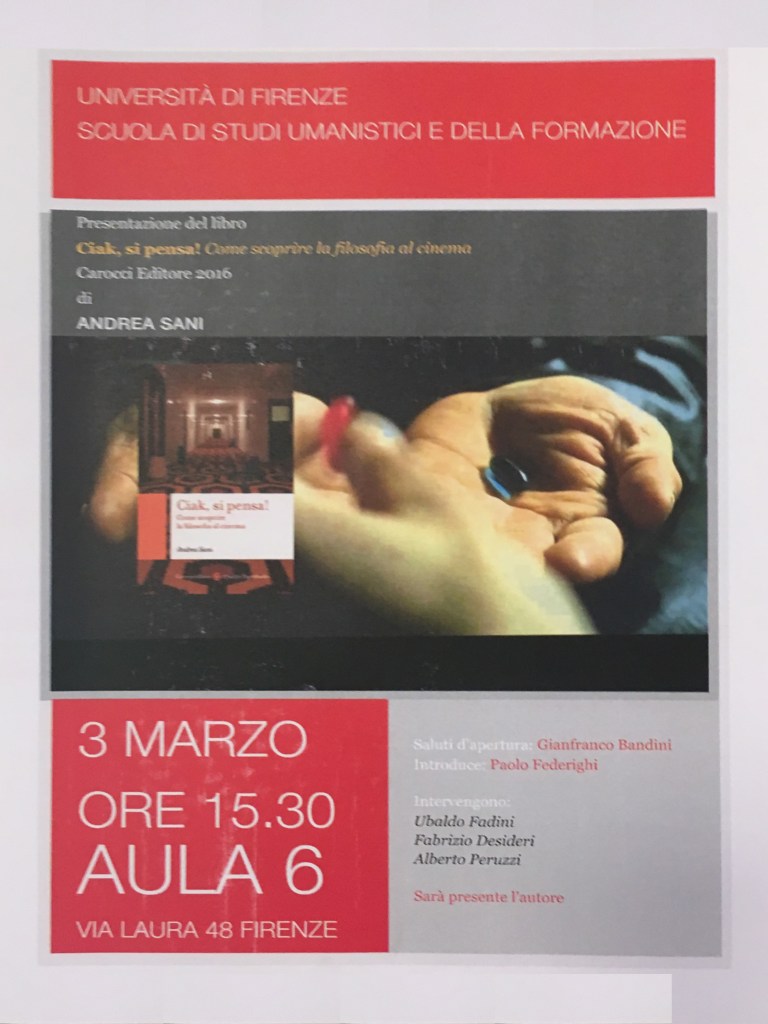 - Presentazione del volume di A. Sani, Ciak si pensa. Come scoprire la filosofia al cinema, Carocci, Roma 2016, presso la Scuola di studi Umanistici e della Formazione dell’Università di Firenze, in via Laura 48, il 3 marzo 2017. Relatori: U. Fadini, G. Bandini, A. Peruzzi, F. Desideri e A. Sani
