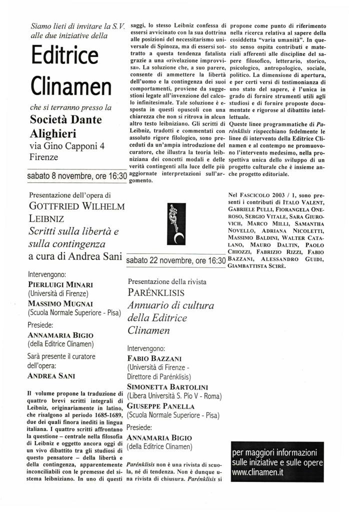 - Presentazione del volume di G. W. Leibniz, Scritti sulla libertà e sulla contingenza, a cura di A. Sani (Clinamen, Firenze, 2003), presso la Società Dante Alighieri, via Gino Capponi 4 Firenze, sabato 8 novembre 2003. Partecipano P. Minari, M. Mugnai e A. Sani