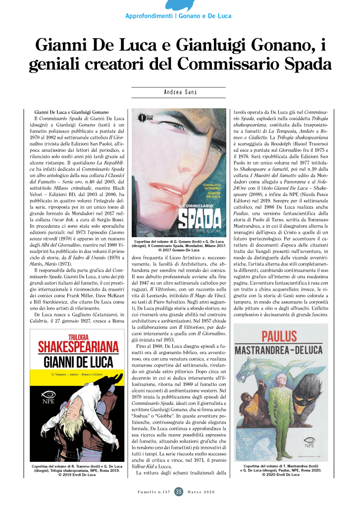 - A. Sani, Gianni De Luca e Gianluigi Gonano, i due geniali creatori del Commissario Spada, in “Fumetto”, n. 137, ANAFI, marzo 2026, pagg. 39-45