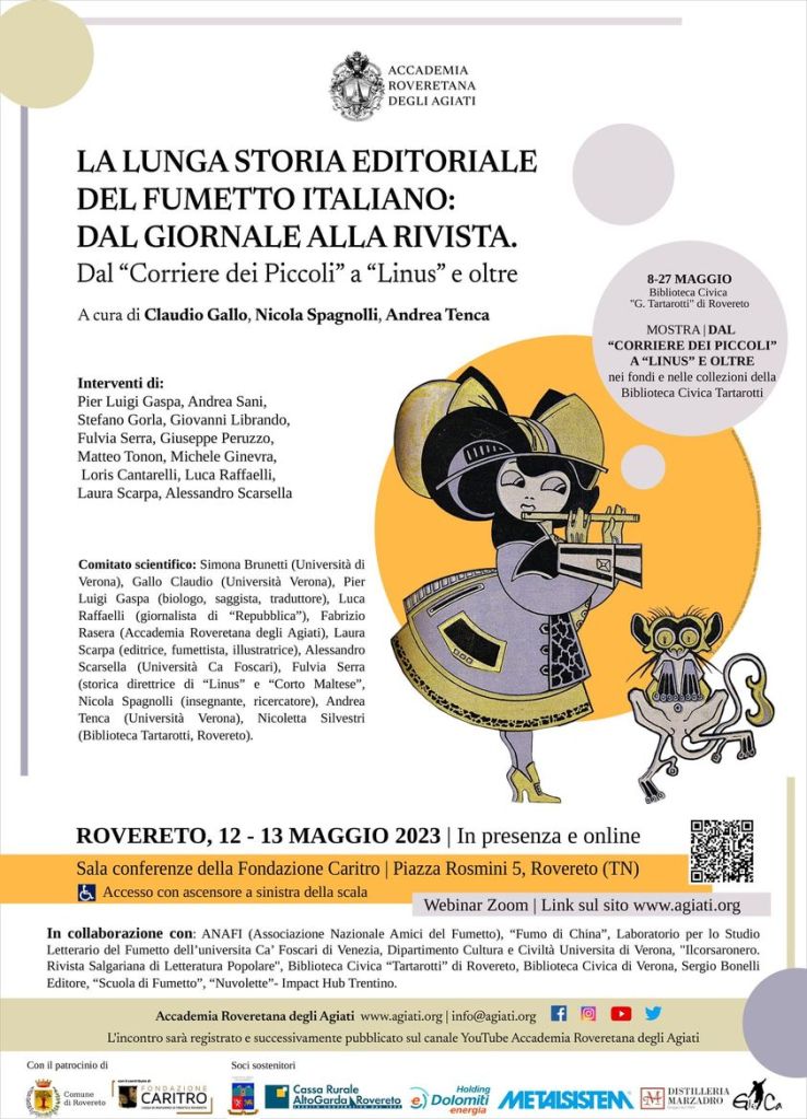 - Gloriosa storia del Corriere dei Piccoli (1908-1996), intervento tenuto nel quadro del convegno di studi “La lunga storia editoriale del fumetto italiano: dal giornale alla rivista”, organizzato dall’Accademia Roveretana degli Agiati di Scienze, Lettere e Arti, e che si è svolto il 12 e il 13 maggio 2023 nella Sala conferenze della Fondazione Caritro, in Piazza Rosmini 5, a Rovereto (TN)